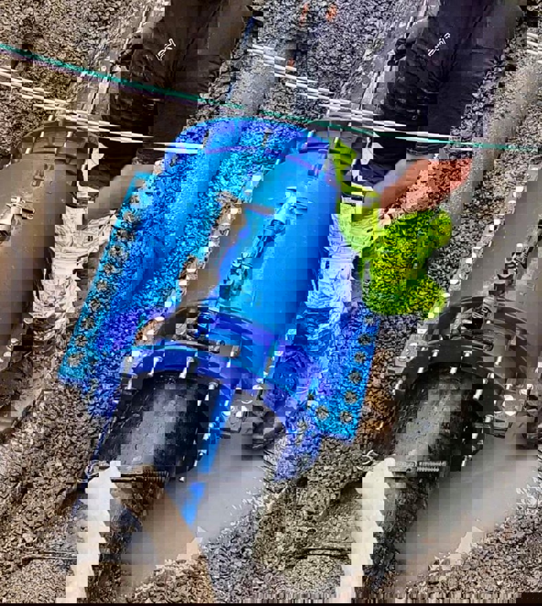 Koppling för inkapsling av läckande svetsmuffar, här på ett PE-rör dy450mm. Monteringen kan utföras utan att stänga av vattnet. Fungerar på alla rörmaterial.
