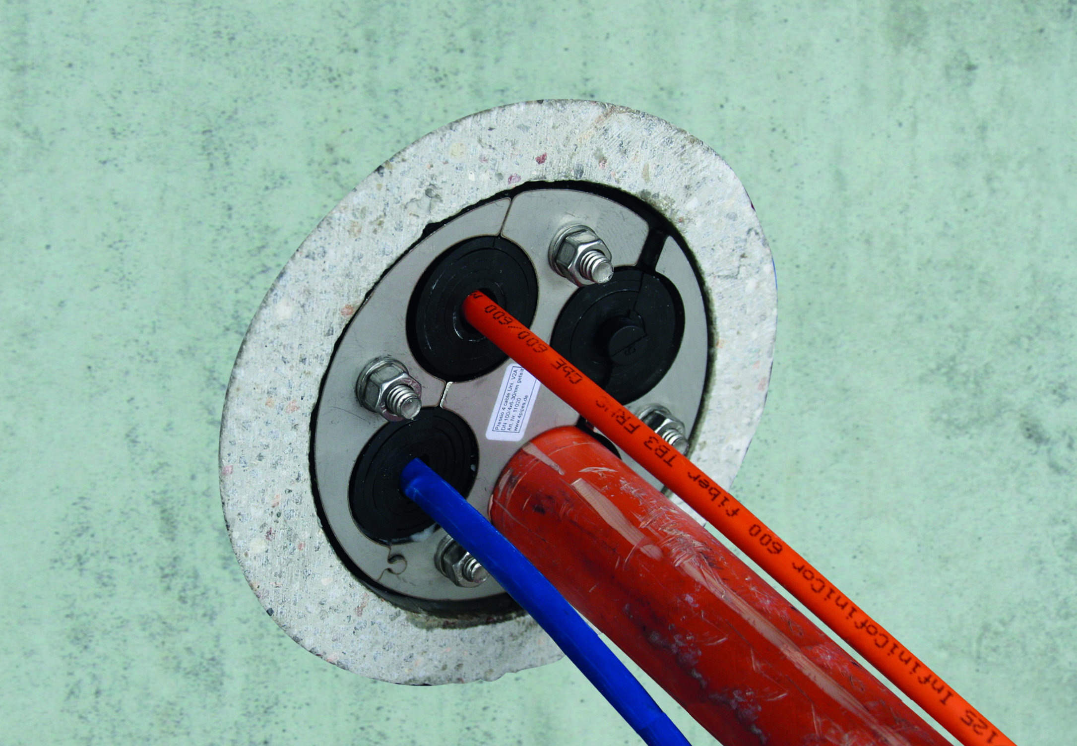 Multigenomföringen är gjord för en säker tätning mot tryckvatten av olika dimensioner av kablar eller rör som går genom väggar.