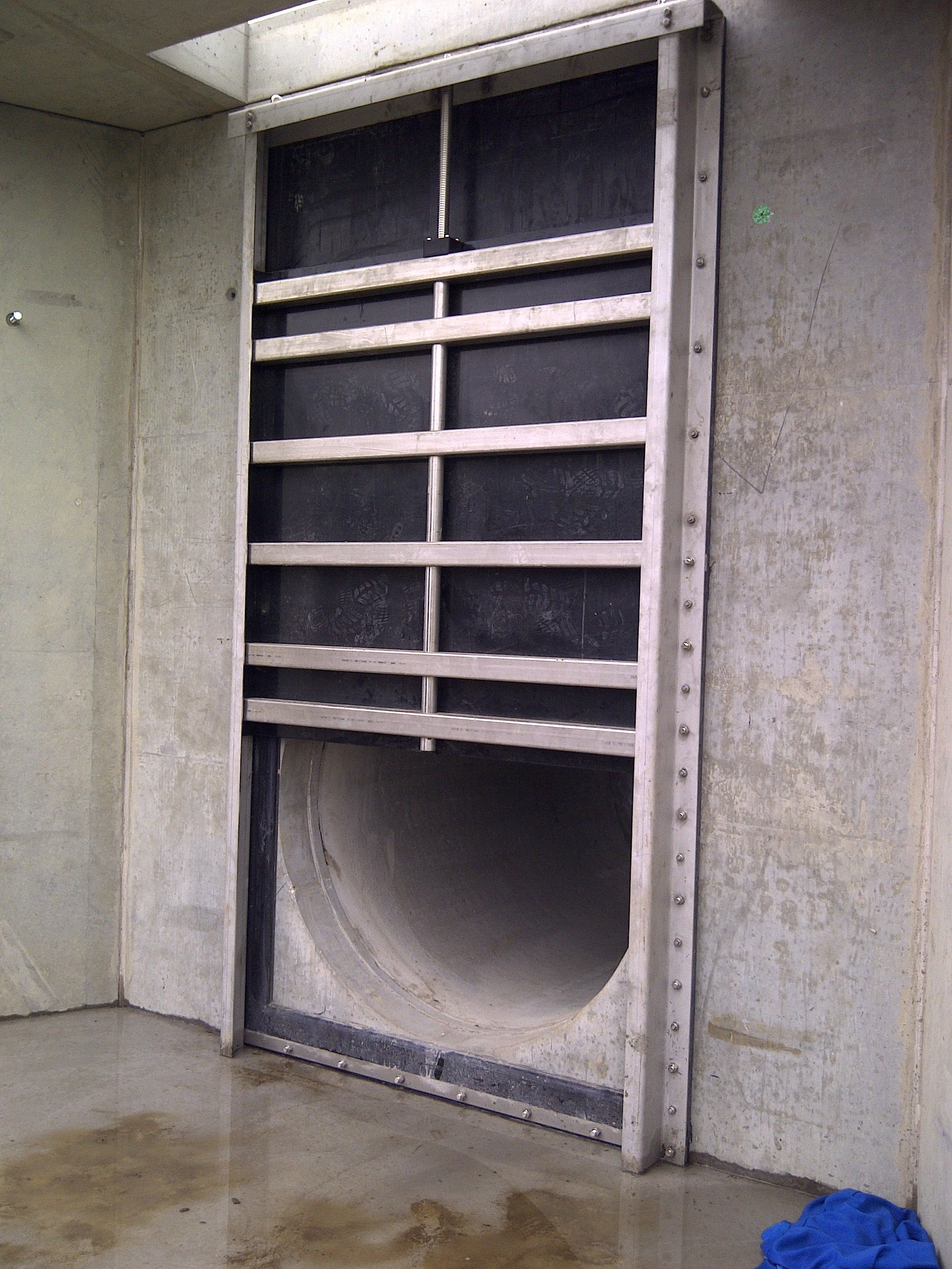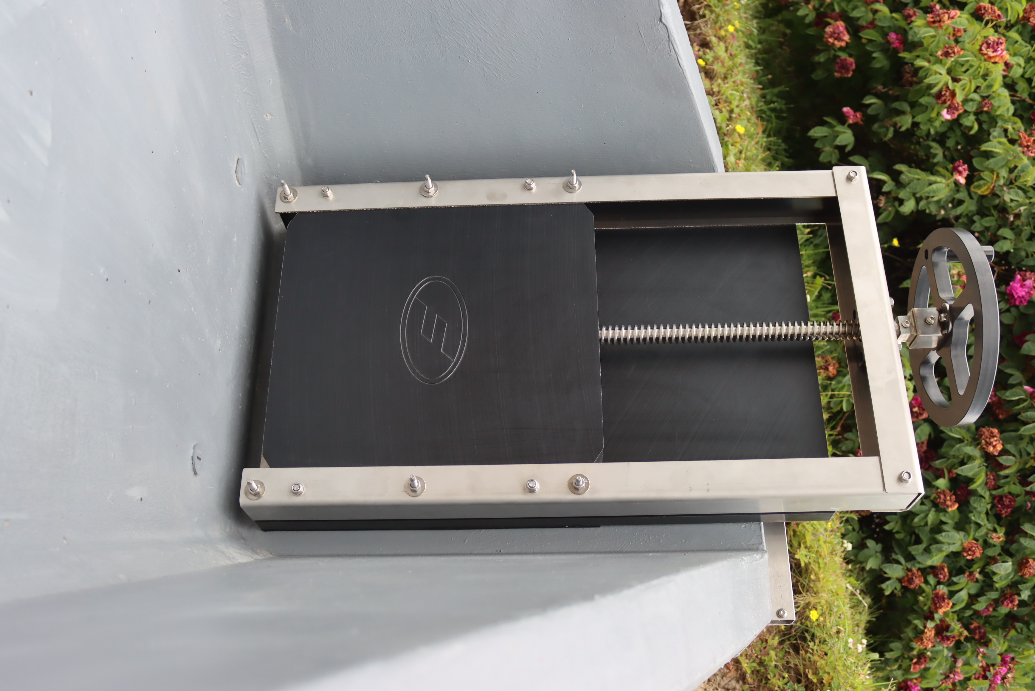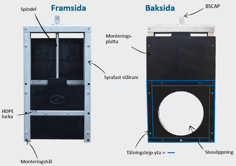 Slussluckorna levereras för montage mot betongvägg. Som standard är de utrustade med en nyckeltopp och en ickestigande spindel, som vrids medsols vid stängning.