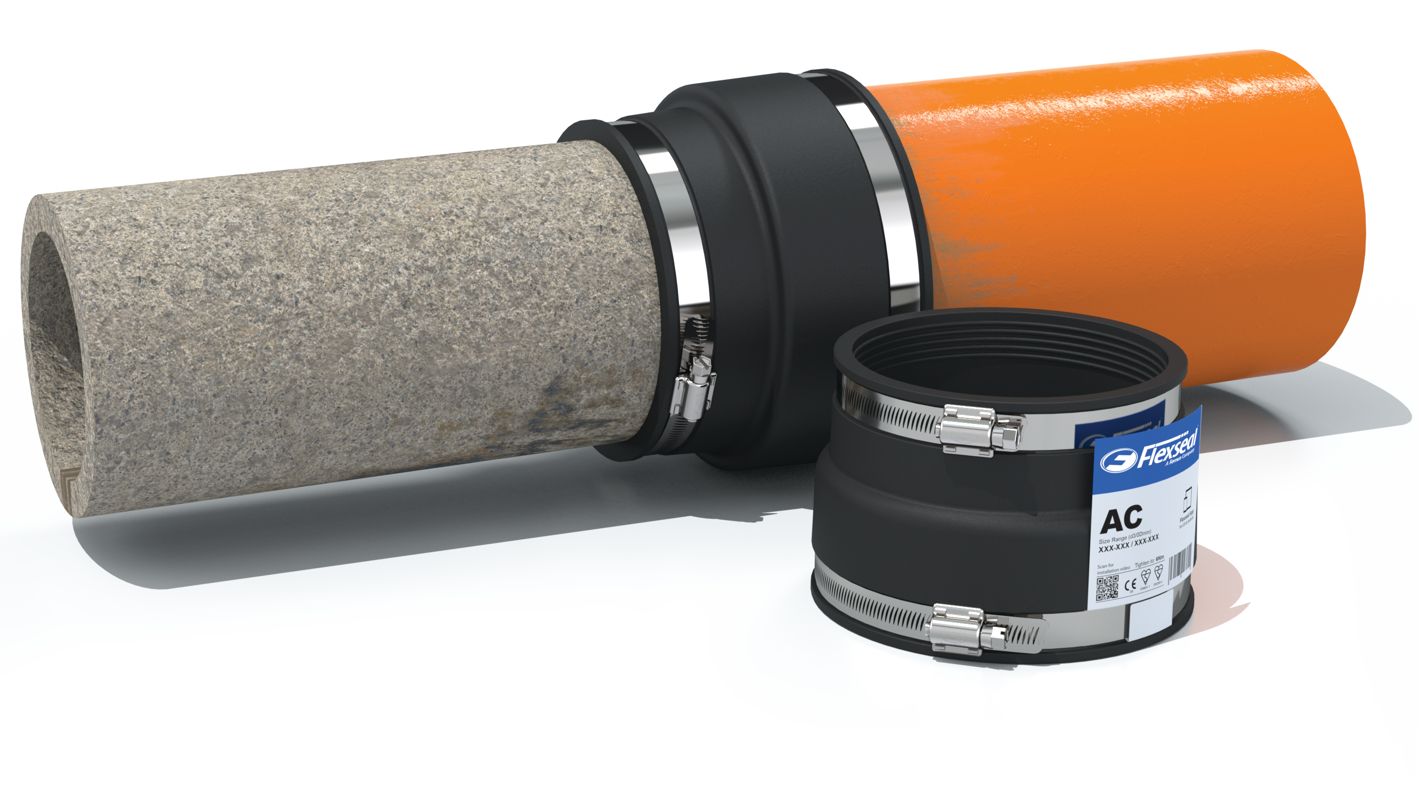 Fernco AC rörkopplingar. Utan stödplåt; klarar tryck upp till 0,6 bar.
