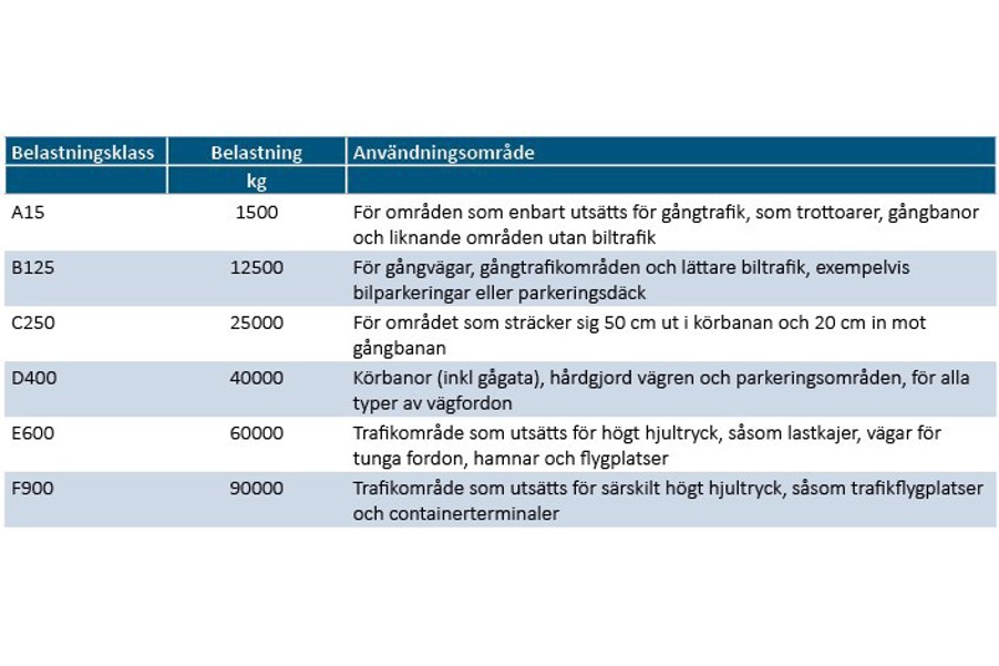 B125 - Max belastning 12500 kg. För gångvägar, gångtrafikområden och lättare biltrafik, exempelvis bilparkeringar eller parkeringsdäck