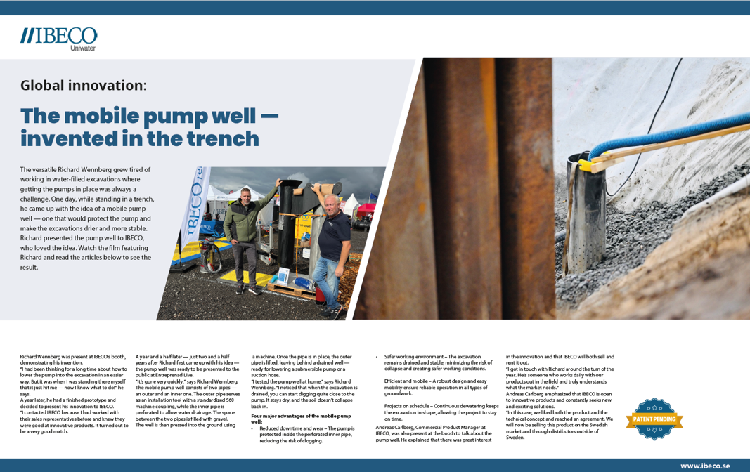 The versatile Richard Wennberg grew tired of working in water-filled excavations where getting the pumps in place was always a challenge. One day, while standing in a trench, he came up with the idea of a mobile pump well — one that would protect the pump and make the excavations drier and more stable. Richard presented the pump well to IBECO, who loved the idea. Watch the film featuring Richard and read the articles below to see the result.