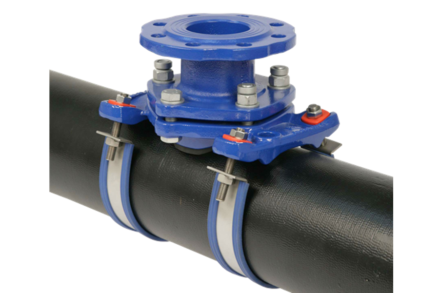 IBECO anborrningsbygel för anborrning under tryck med fläns. Köp till monteringsband anpassat för dimension på rör.