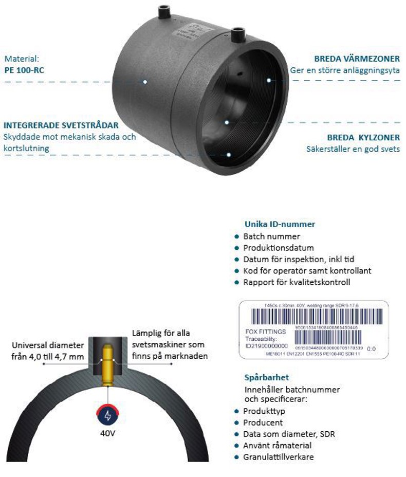 Innovativa elektrosvetsdetaljer i PE100-RC material som kan svetsas med alla förekommande elektrosvetsmaskiner på marknaden.