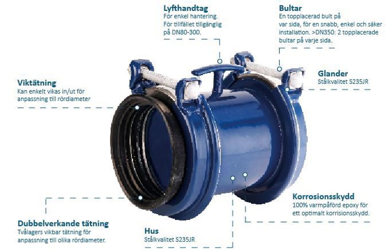 Innovativ rörkoppling för många användningsområden för alla typer av rör. Låg vikt, T-handtag och toppvända bultar gör monteringen enkel, säker och effektiv - en kostnadsbesparande produkt på flera sätt. Patenterad hydraulisk packning som gör tätningen mot rör extra effektiv. Nu med en ny packning där du enkelt kan vika ut packningen för att utnyttja största spännvidden.