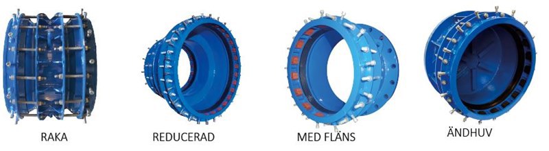 Kopplingarna finns i raka, reducerade, med fläns samt som ändhuvar.