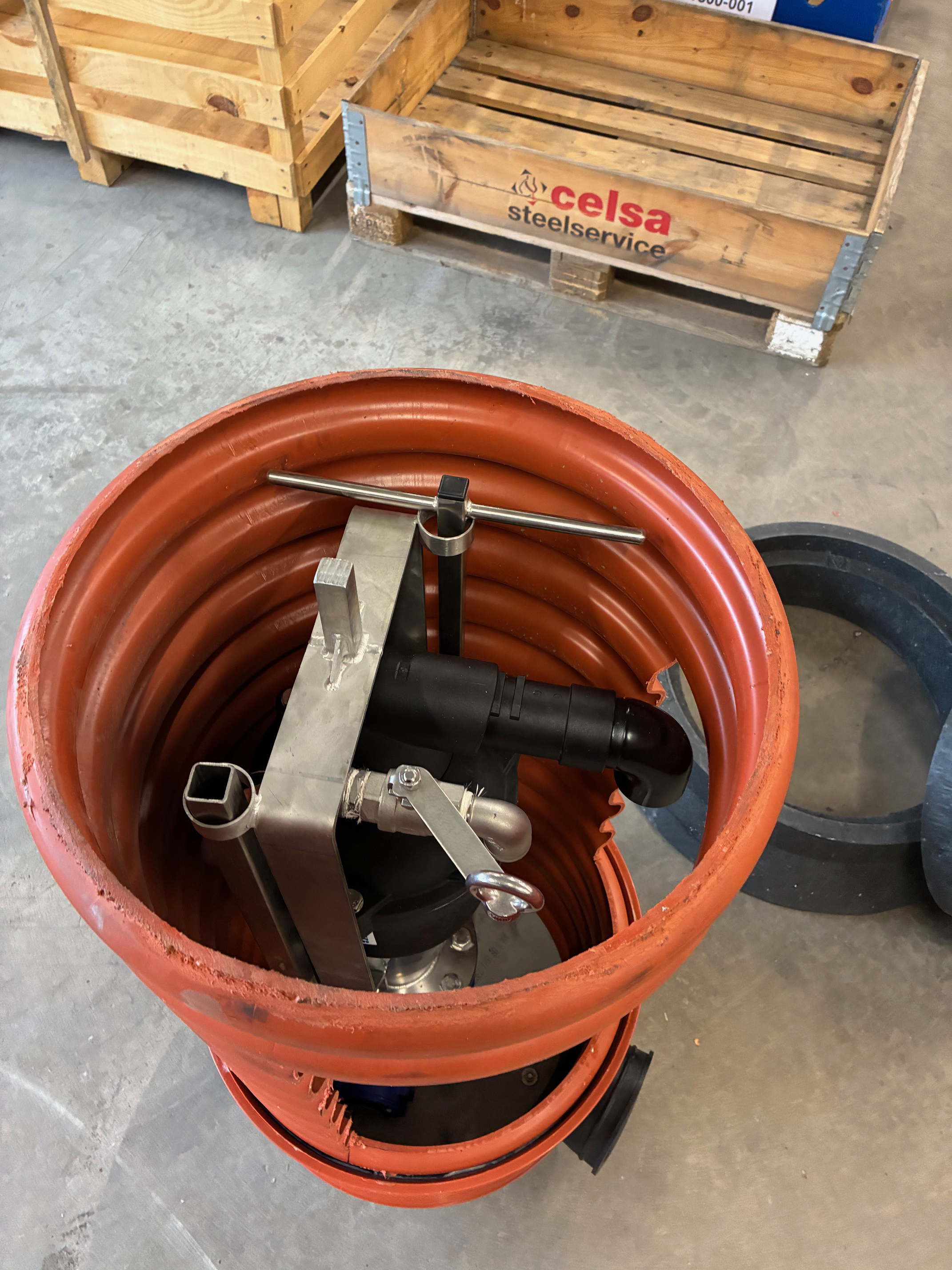 Brunnen är baserad på en 425mm trumma och är försedd med DN80-flänsanslutning för enkel integrering i befintligt ledningsnät eller nyinstallation.