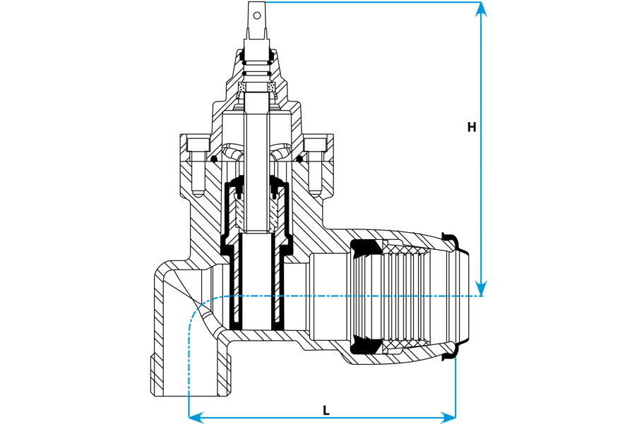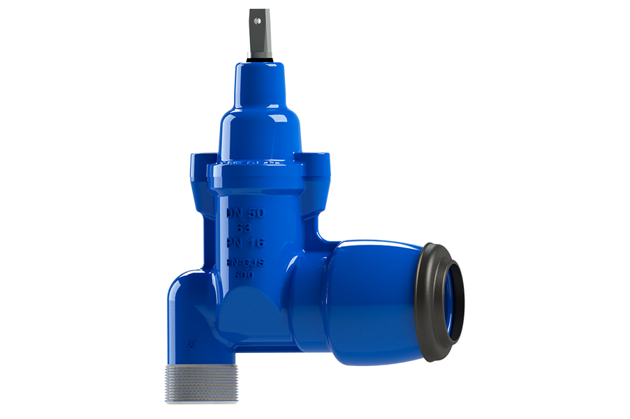 Servisventil PN16. 90° med direktinstick för PE och utv. gänga; fritt genomlopp.