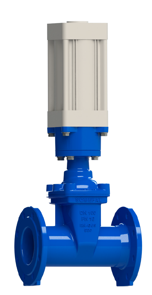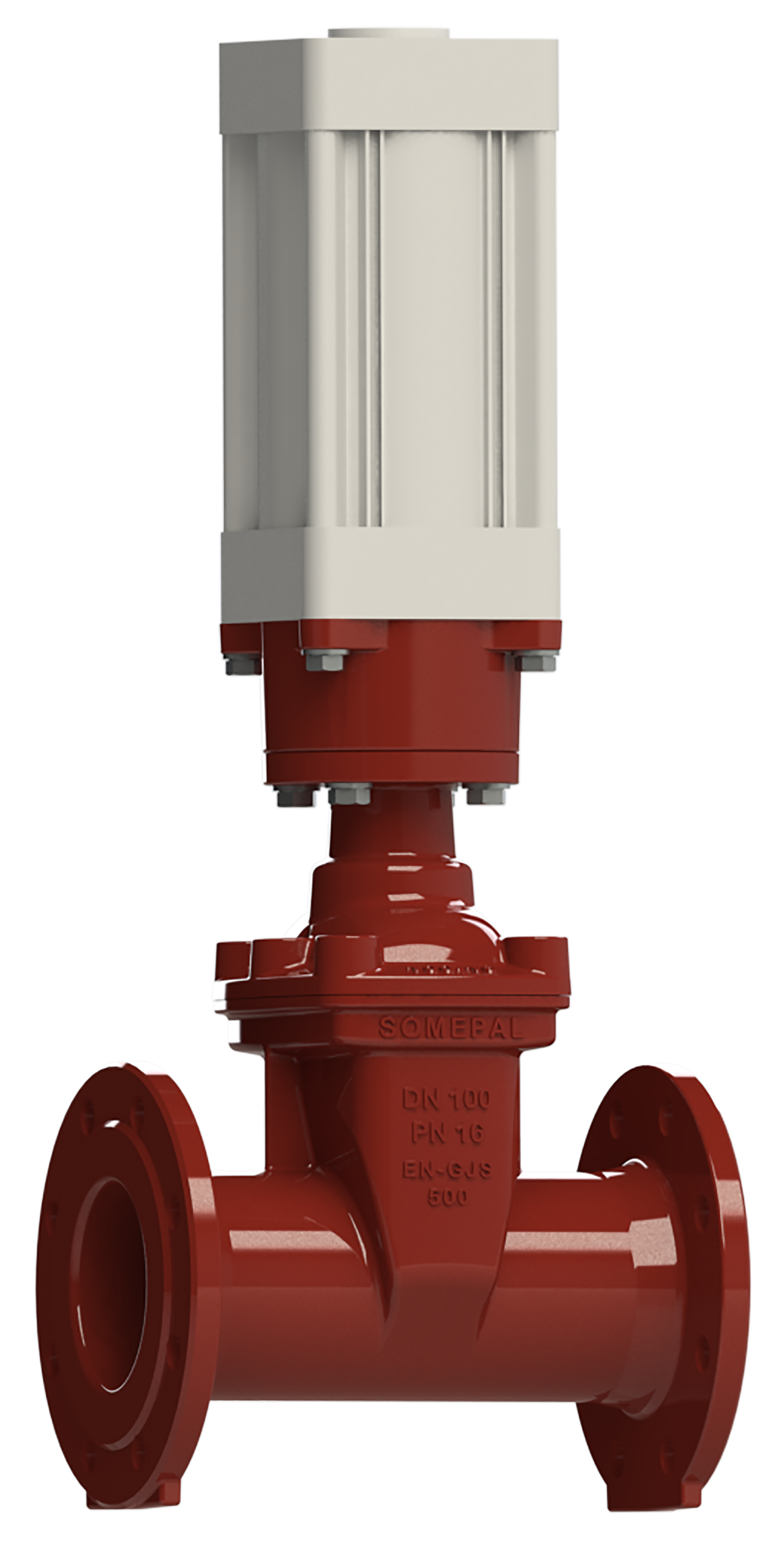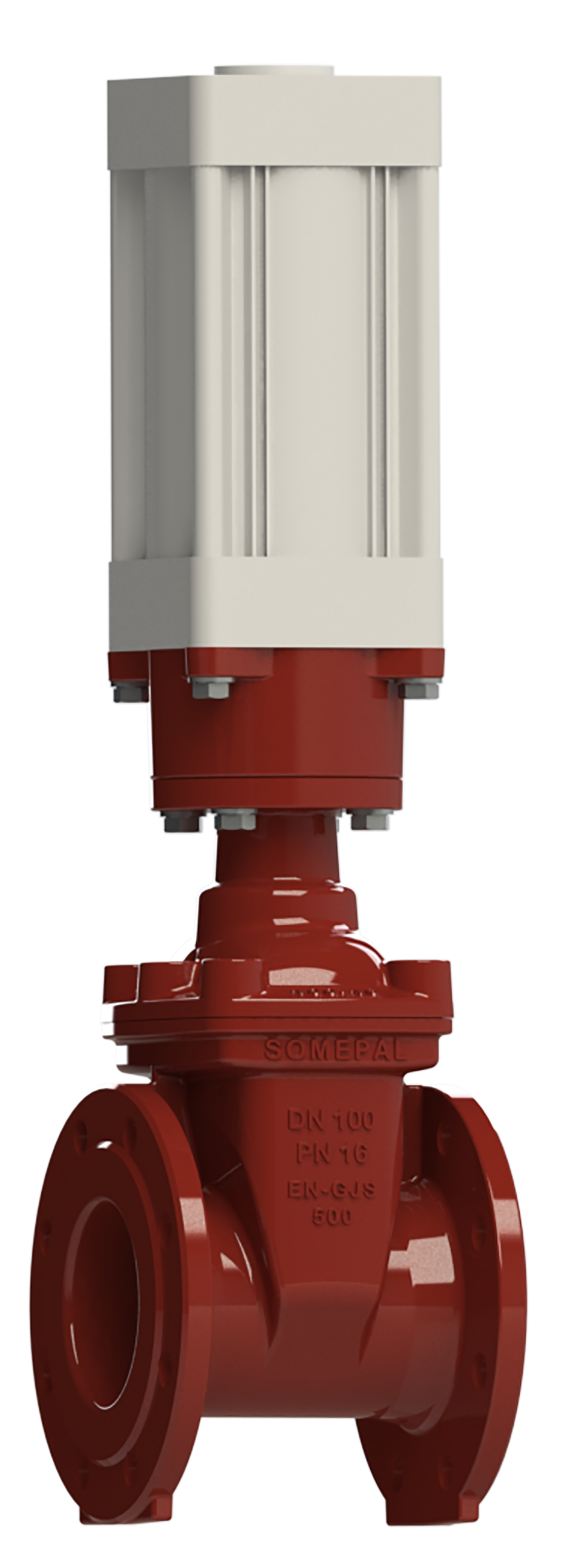 Fucoli-Somepal slussventiler. Med fläns; kort bygglängd F4; pneumatisk aktuator; fritt genomlopp.