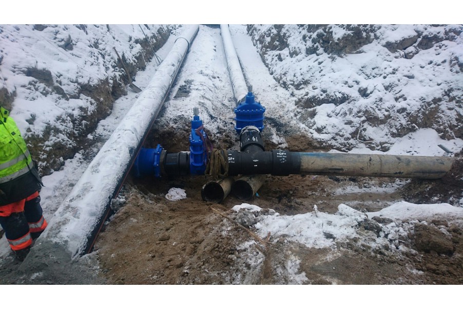 Med PE-ändar, PE100, PN16, SDR11; fritt genomlopp.